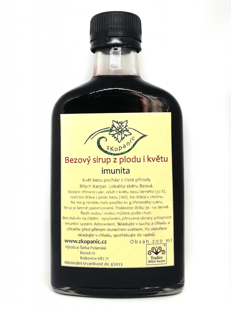 : třtinový cukr, 100% šťáva z plodu bezu (31%), výluh z květu bezu černého (17 %), bio šťáva z citrónu .