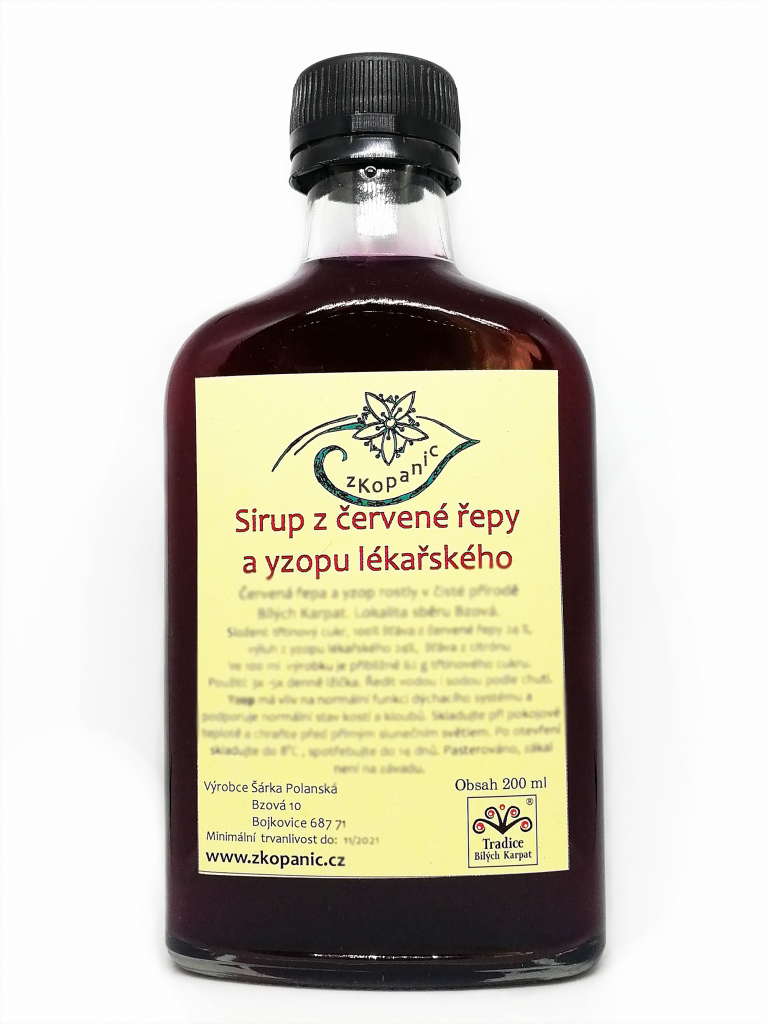 Složení: třtinový cukr, 100 % šťáva - červená řepa (obsah v sirupu 24% ), vodný výluh yzop lékařský 24%,